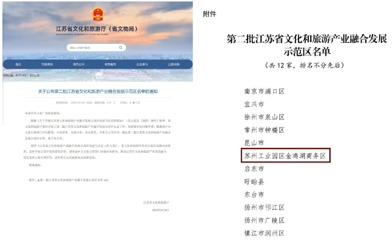 近日,省文化和旅游廳公布第二批江蘇省文化和旅游產業融合發展示范區名單,全省共有12家單位入圍,蘇州工業園區金雞湖商務區上榜。