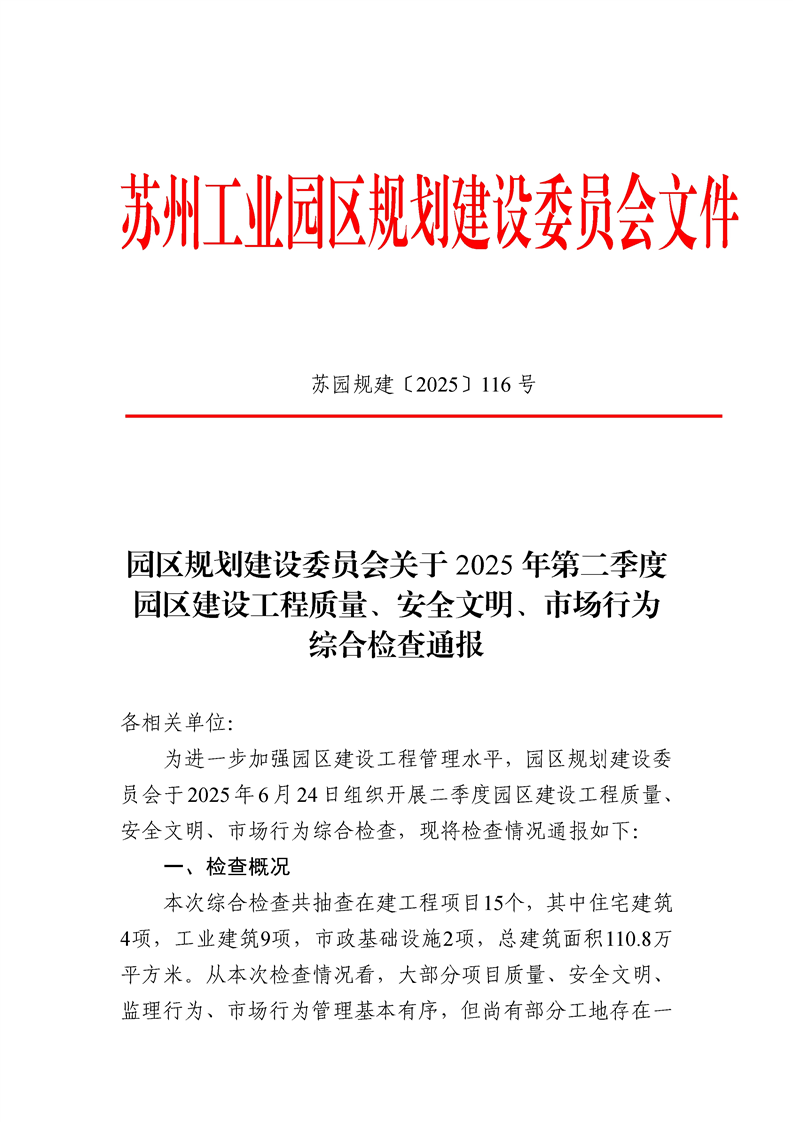 園區規劃建設委員會關于2025年二季度園區建設工程質量、安全文明、市場行為綜合檢查通報