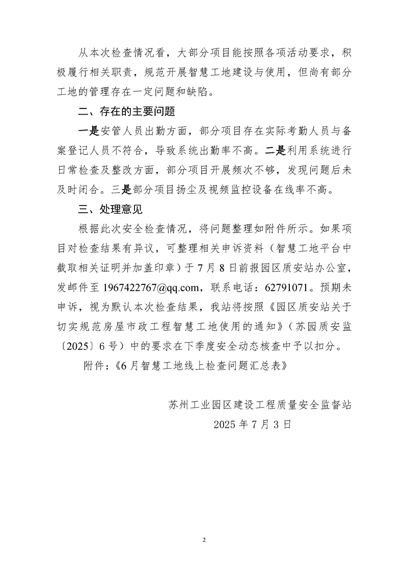 園區質安站關于6月份智慧工地使用情況線上檢查的公示