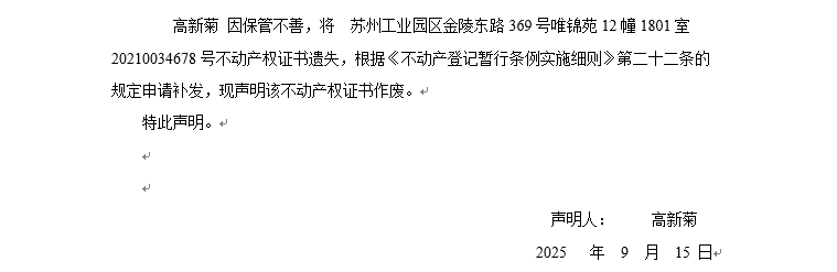 蘇州工業(yè)園區(qū)金陵東路369號唯錦苑12幢1801室20210034678 號不動產(chǎn)權(quán)證書遺失聲明