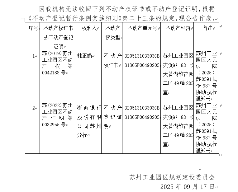 不動產權證書/登記證明作廢公告蘇園 證廢字2025(0141)號(天著湖韻花園二區49幢205室)