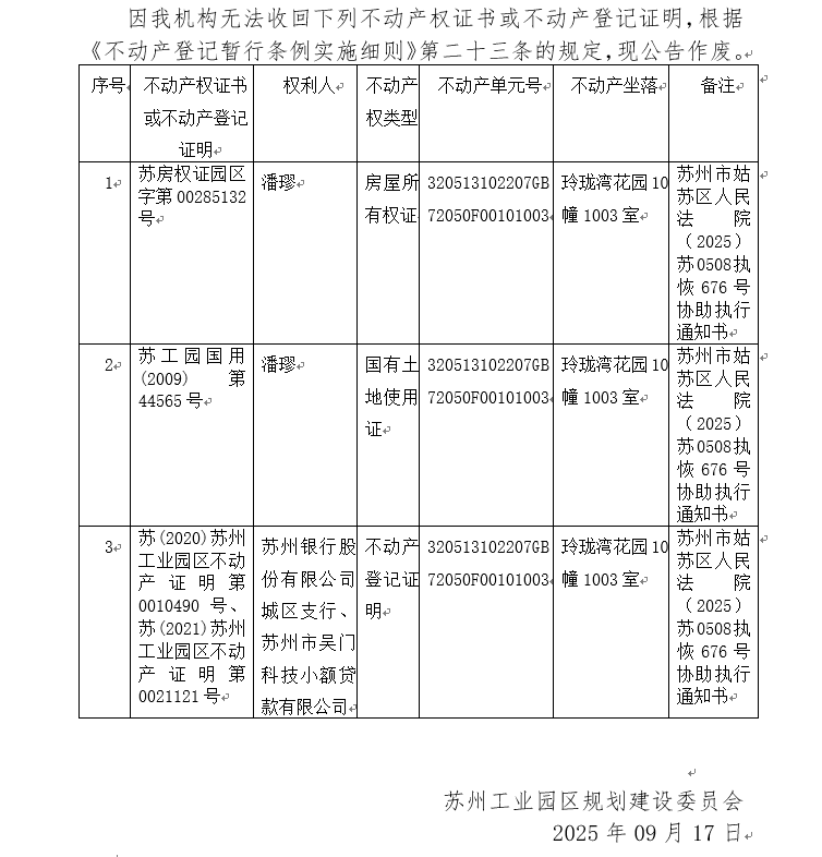 不動產權證書/登記證明作廢公告蘇園 證廢字2025(0143)號(玲瓏灣花園10幢1003室)