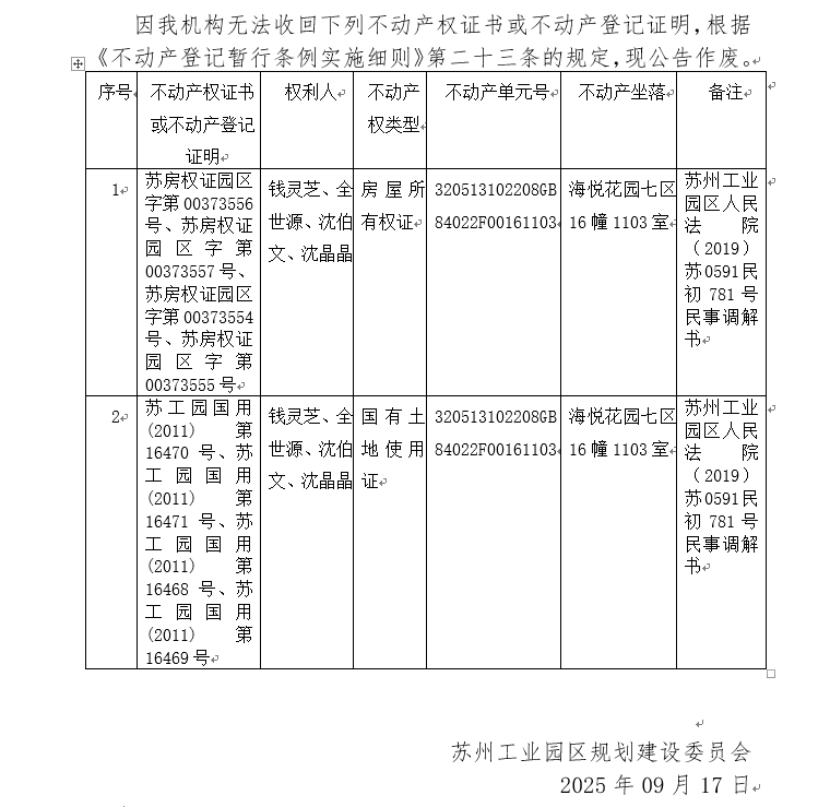 不動產(chǎn)權(quán)證書/登記證明作廢公告蘇園 證廢字2025(0145)號(海悅花園七區(qū)16幢1103室)