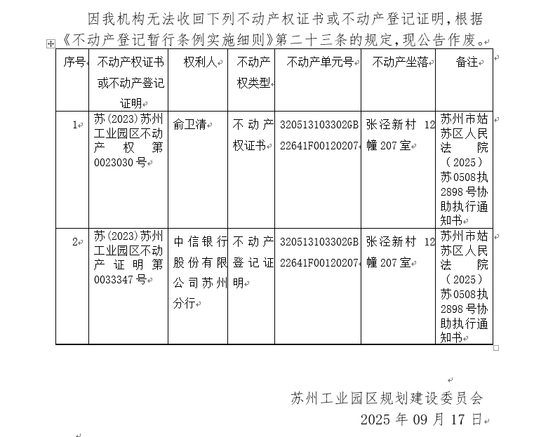 不動(dòng)產(chǎn)權(quán)證書/登記證明作廢公告蘇園 證廢字2025(0142)號(hào)(張涇新村12幢207室)