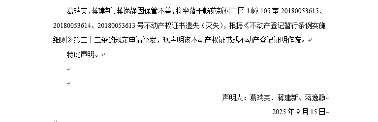 關于暢苑新村三區1幢105室20180053615、20180053614、20180053613號不動產權證書遺失聲明