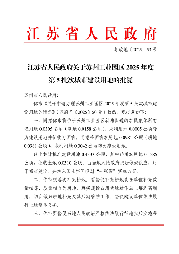 蘇州工業(yè)園區(qū)2025年度第5批次城市建設用地-批文