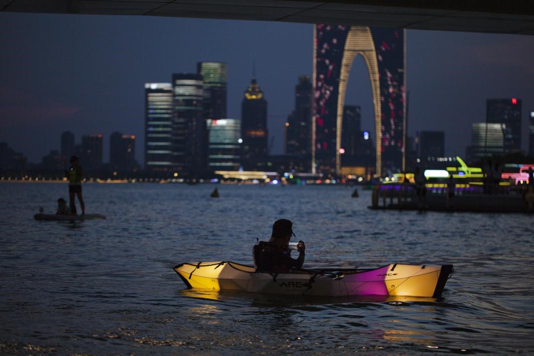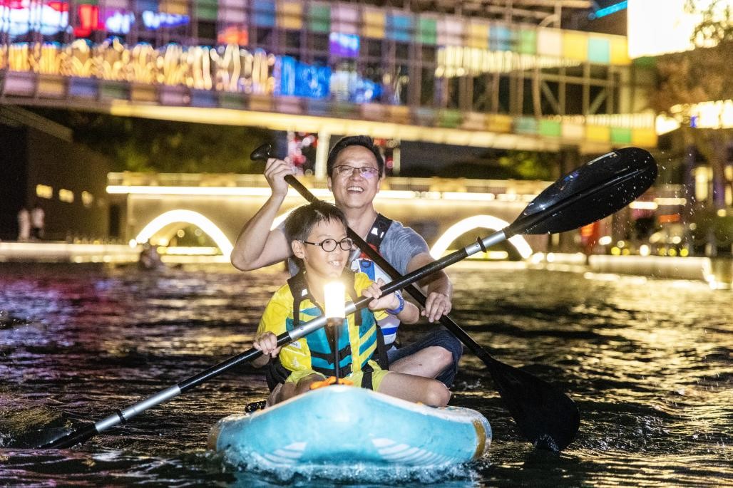 蘇州森野主義副總經理、水上運動與安全主管張迪介紹:“夏季以來,園區開展了各類豐富的水上項目,槳板運動易上手,受眾群體也越來越多。自項目啟動,參與人數相比往年同期增長30-40%,游客參與積極性很高。”即日起至10月26日,中央河每周末都將舉辦皮劃艇槳板項目活動,持續點亮城市夜色。