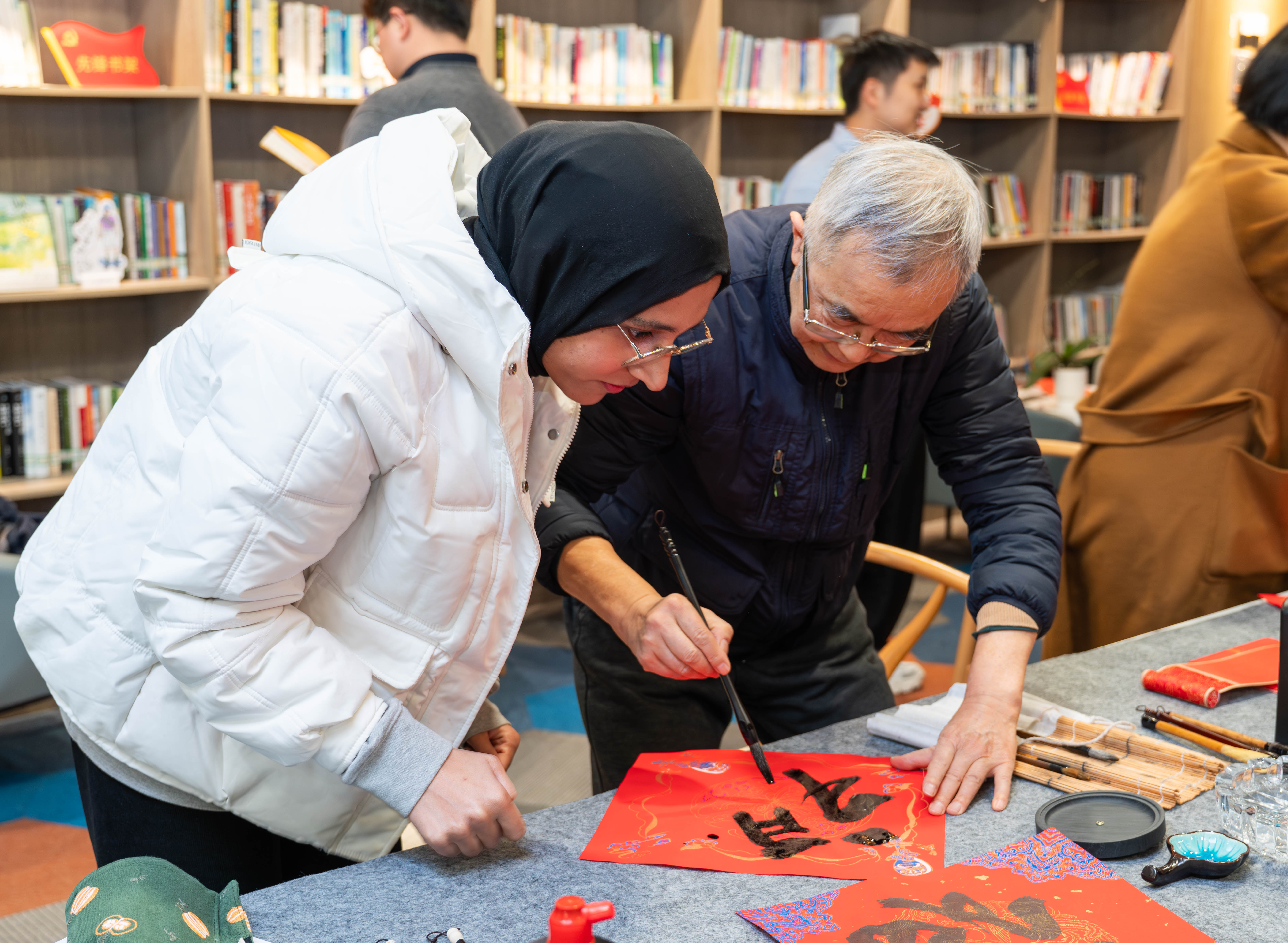 Mariam Dilawar來自巴基斯坦,第一次寫春聯,她覺得充滿挑戰和趣味。“整個參與的過程非常好。專業的書法家們很友好,他們會細致地教我如何拿毛筆、如何書寫,我很樂于嘗試。我對中國的春節很熟悉,但這是我第一次在蘇州慶祝春節。我很高興有機會探索中國文化,而且看到人們慶祝新年的過程也非常有趣。”