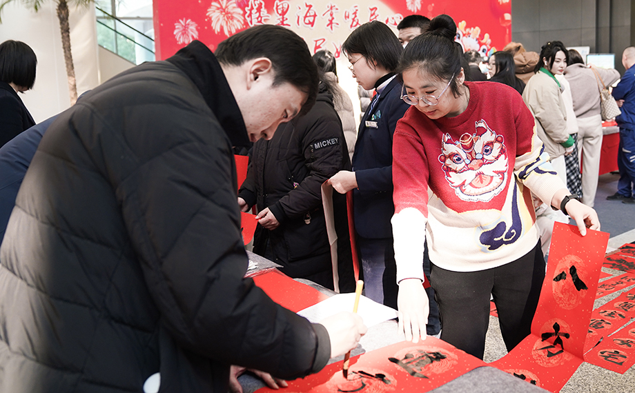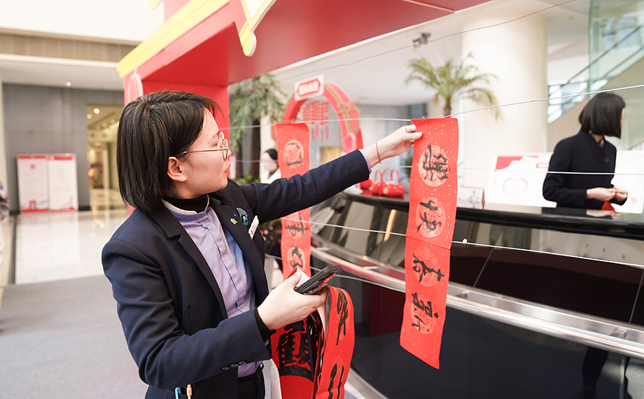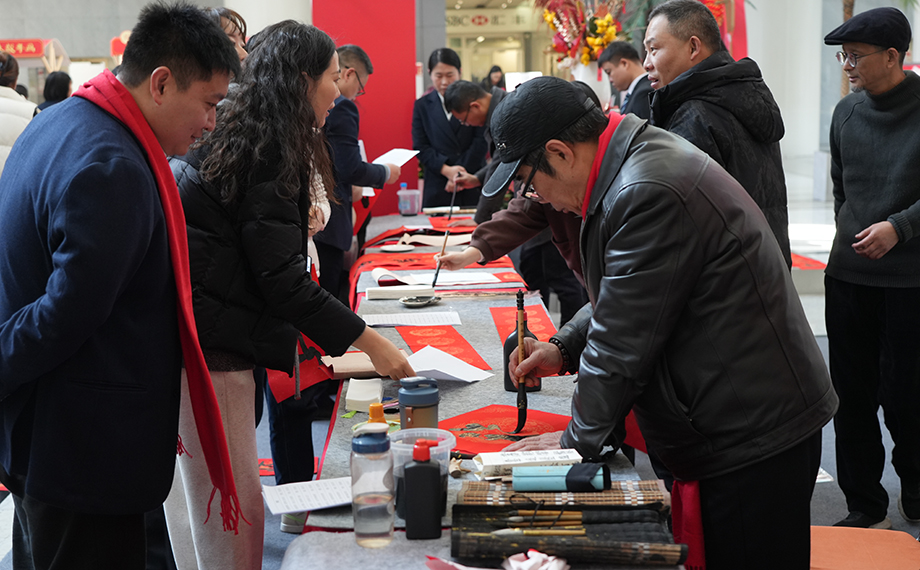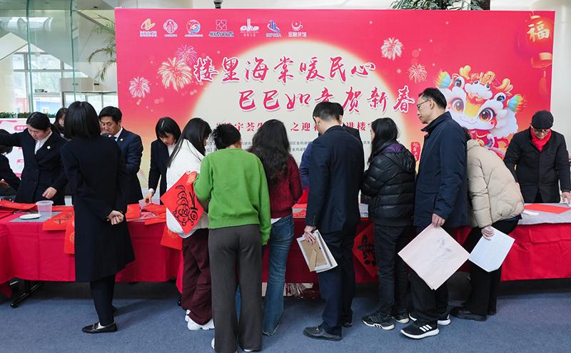 活動現(xiàn)場一片歡樂祥和的節(jié)日氛圍,前來領取春聯(lián)及福字的員工絡繹不絕,大家手捧著新鮮出爐的春聯(lián),臉上洋溢著幸福的笑容,對書法家們的精湛技藝贊不絕口。一位在國際大廈工作的員工表示:“在超市選購春聯(lián)雖然方便,但現(xiàn)場手寫的春聯(lián)更有溫度、更有年味。我拿到了一副很合我心意的手寫春聯(lián),一定要把這份福氣帶回家?!倍潭虄蓚€小時內(nèi),現(xiàn)場就送出了約500副春聯(lián)和500個福字,將滿滿的福氣傳遞到每個人手中。