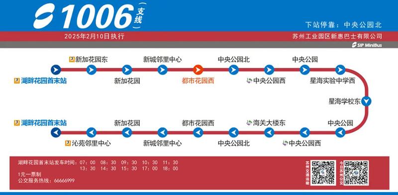 1006路支線則主要方便湖西新加花園、新城花園、都市花園、沁苑小區(qū)、湖畔花園等小區(qū)居民前往中央公園、星海學(xué)校的出行,營(yíng)運(yùn)時(shí)間以湖畔花園首末站為準(zhǔn),分別為7:00、8:30、9:30、10:30、11:30、13:30、14:30、15:30、17:00、18:00。