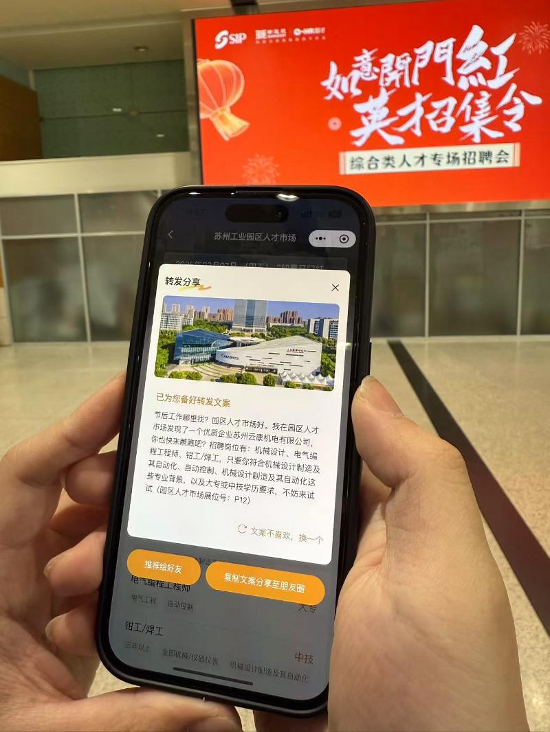 2025年,園區人才市場在而立之年迎來煥新登場,軟硬件設施全面升級,利用最新數字化手段實現招聘信息即時交互?,F場崗位信息與手機實時互聯,發現心儀職位可同步生成AI自動推薦,一鍵觸達、轉發,“呼朋喚友”共赴一場春風之約。
