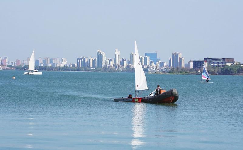 昨日,園區金雞湖春風和煦,水上運動項目熱度大增。在風之園碼頭附近水域,皮劃艇劃過碧藍的湖面。