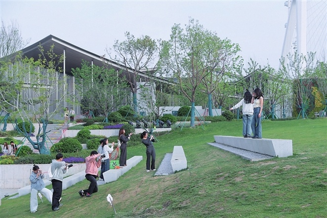 昨日,外地趕來“打卡”的姑娘,按照網(wǎng)上做好的構(gòu)圖攻略,調(diào)整取景框的角度,復(fù)刻取景“蘇州之眼”的完美角度。