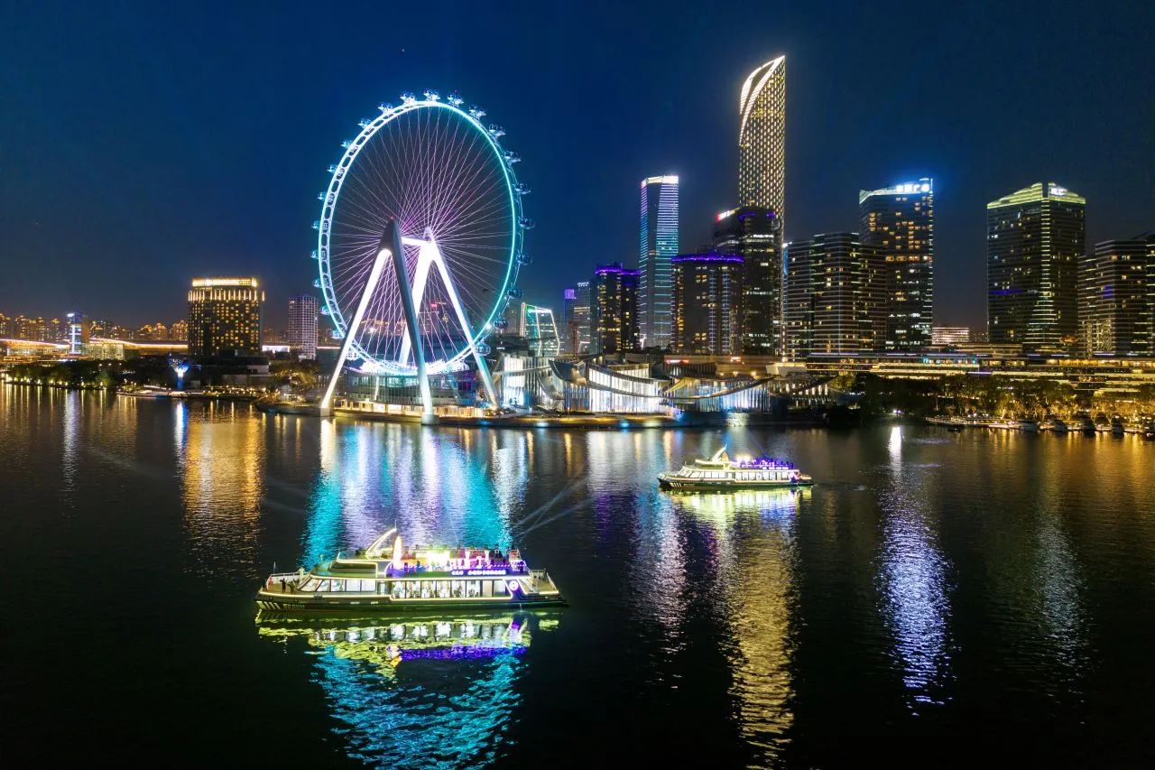 如果說“蘇州之眼”是天空的詩篇,那么右岸新航線就是水面的畫卷。夜幕降臨,“蘇州之眼”摩天輪星光閃耀,金雞湖雙體新游船霓虹流轉,水岸光影交相輝映,為園區這座現代化新城更添了幾分夢幻與浪漫色彩,令人流連忘返。
