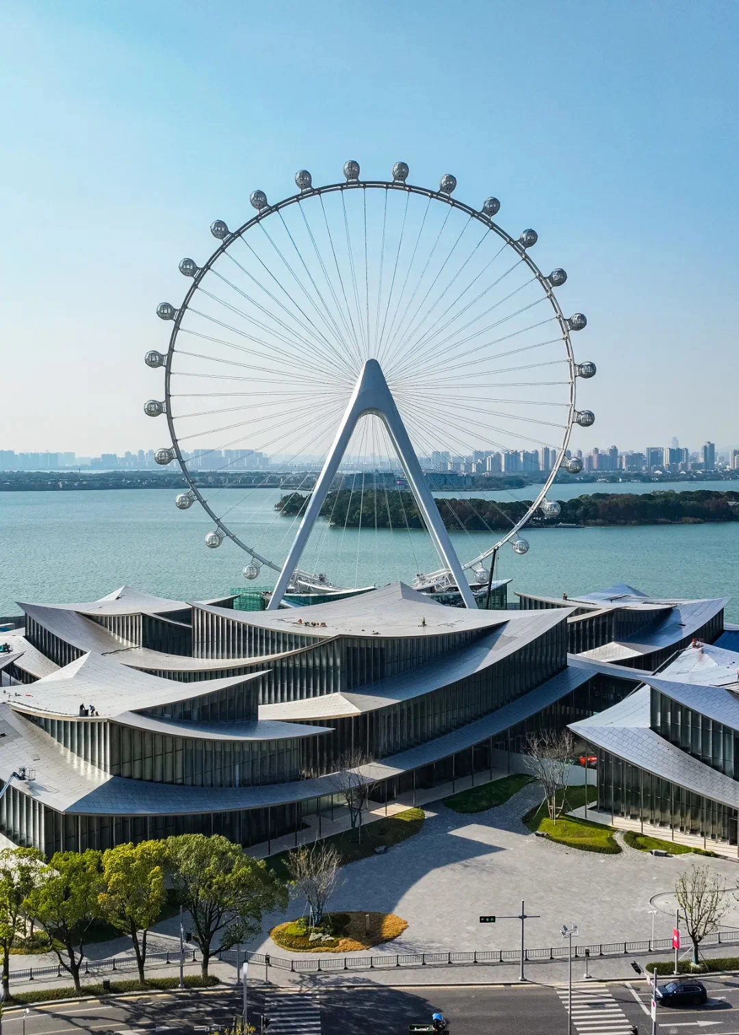 據介紹,“蘇州之眼”的設計靈感源于江南水鄉的柔美與蘇州園林的意境。通過異型雙立柱輪輻式結構及回轉式太空艙,既保留了傳統水鄉的婉約氣質,又以科技感造型融入現代CBD天際線。摩天輪底部建筑運用“折紙藝術”,采用折扇形屋頂及大面積落地玻璃設計,打造“濱水而居”的獨特空間體驗。