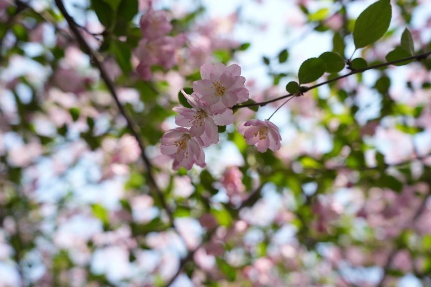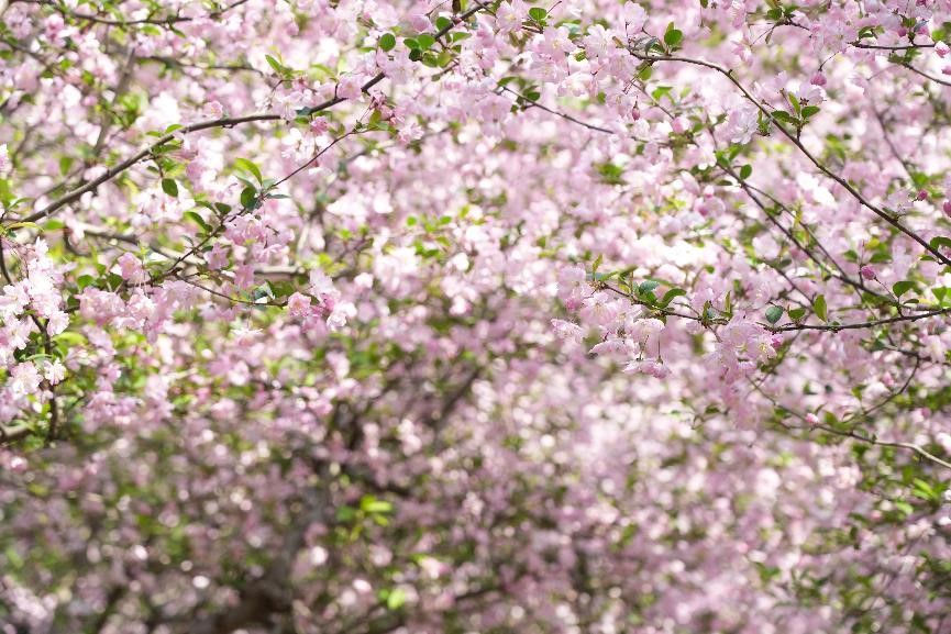 海棠花朵朵盛放時(shí),枝條被花朵壓得微微低垂,形成了一片粉紅色的花海,宛如粉色的云霞,陽(yáng)光透過(guò)花瓣灑下,光影斑駁,形成了一幅幅絕美的畫面。