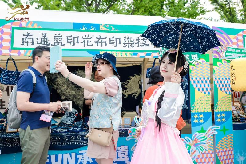 南通藍染、鎮(zhèn)江竹編、阿林老繡、貴州印染、秋和月手作纏花、山澗民族風(fēng)文創(chuàng)等6項外地非遺及品牌首次參與盛會。南通藍染技藝市級傳承人曹春燕一邊耐心地向大家展示藍染制品,一邊興奮地說:“攤位上的藍染制品都是純手工制作,這次我們是第一次到金雞湖龍船市擺攤,好多小朋友都對藍印花布的制作工藝很感興趣,我們都一一介紹,這個平臺真是太棒了,給了這項古老技藝一個絕佳的推廣展示機會,讓更多人了解藍染、愛上藍染。”