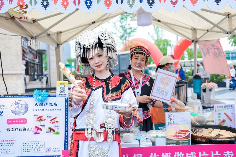 “龍舟有好市”民族美食市集同樣人氣爆棚,美食市集匯集30余個美食攤位,來自23個不同民族美食香氣四溢,打造舌尖上的“民族風(fēng)”,為現(xiàn)場市民游客提供充足能量補給。剛出爐的烤乳扇滋滋作響,刷上玫瑰醬,甜香撲鼻;軟糯的朝鮮打糕裹著豆面和糖粉,引得游客們紛紛駐足購買品嘗。