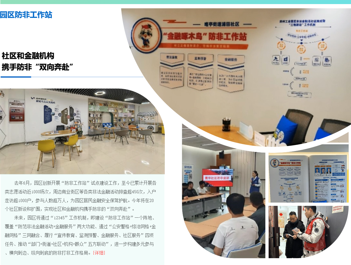 今年6月是第13個(gè)全國(guó)防范非法集資宣傳月,6月16日,蘇州工業(yè)園區(qū)舉行2025年防范非法金融活動(dòng)集中宣傳日活動(dòng)?,F(xiàn)場(chǎng),園區(qū)金融風(fēng)險(xiǎn)防控系統(tǒng)正式上線,20個(gè)防非工作站新設(shè)和擴(kuò)圍,進(jìn)一步深化金融普法教育,推動(dòng)“防非”宣傳教育工作落地生根、開花結(jié)果。防范非法金融活動(dòng)宣傳教育工作是維護(hù)金融秩序穩(wěn)定、保障金融穩(wěn)健運(yùn)行的重要基石。作為區(qū)域金融高地,園區(qū)堅(jiān)持線上線下統(tǒng)籌推進(jìn),筑牢防范非法集資的社會(huì)防線。線上,動(dòng)態(tài)監(jiān)測(cè)全域企業(yè),提高風(fēng)險(xiǎn)識(shí)別科學(xué)性和準(zhǔn)確性,逐漸形成“底數(shù)清、責(zé)任明、發(fā)現(xiàn)早、處置快”一網(wǎng)縱觀全局的智能神經(jīng)中樞;線下,深化“防非工作站”內(nèi)涵,用好金融“鄰”距離系列活動(dòng)資源,同時(shí)積極發(fā)動(dòng)1.7萬(wàn)... [詳細(xì)]