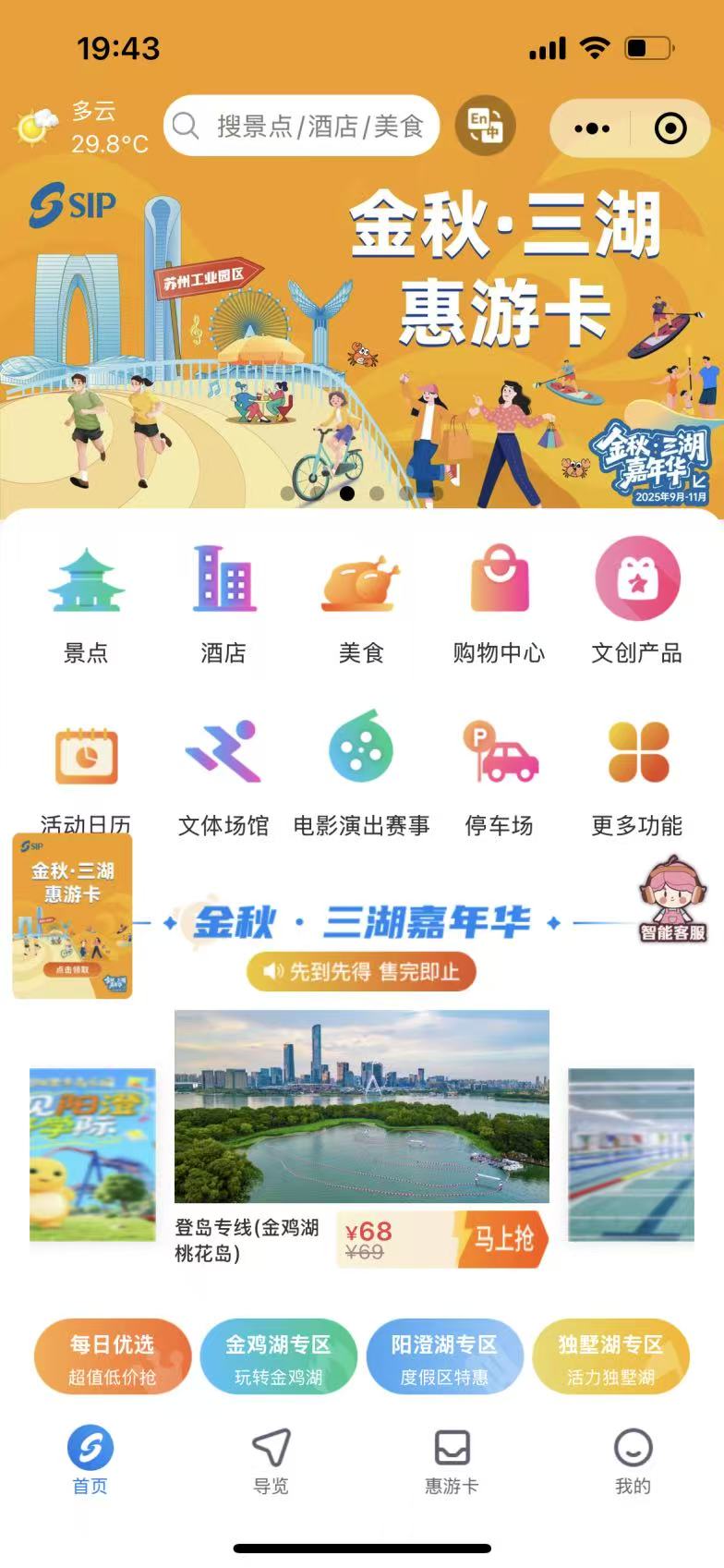 為進一步提升市民游客的幸福感。嘉年華期間,園區(qū)發(fā)布《金秋?三湖嘉年華指南》,集中呈現(xiàn)活動日程、推薦玩法、消費地圖等實用信息,為市民游客暢享園區(qū)金秋文旅盛宴提供全方位指引?!敖鹎铩と萦慰ā焙汀敖鹎铩と文耆A消費券”,則匯聚千余家商戶實實在在的優(yōu)惠,以及50余場演出、近20場體育賽事和40余場展覽展會,覆蓋餐飲、住宿、文旅、會展、汽車等重點消費領(lǐng)域。游客可以通過“惠游園區(qū)”公眾號、“數(shù)字金雞湖”、“同程旅行”小程序等平臺,領(lǐng)取專屬折扣與滿減禮遇,將出行、住宿、消費一手掌握。此外,憑借演藝賽事門票,還能兌換通用消費券及商家專屬禮包,延伸文旅體驗,盡享“票根+”福利。