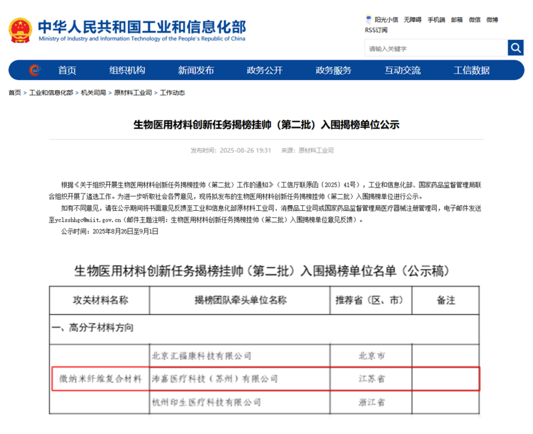 2025年8月,沛嘉醫(yī)療與聯(lián)合體成員單位等共同申報(bào)的“用于心臟瓣膜的超高分子量聚乙烯微納米纖維仿生復(fù)合材料研發(fā)及應(yīng)用”項(xiàng)目,成功入選由工業(yè)和信息化部、國家藥品監(jiān)督管理局聯(lián)合發(fā)布的生物醫(yī)用材料創(chuàng)新任務(wù)揭榜掛帥(第二批)入圍單位名單。