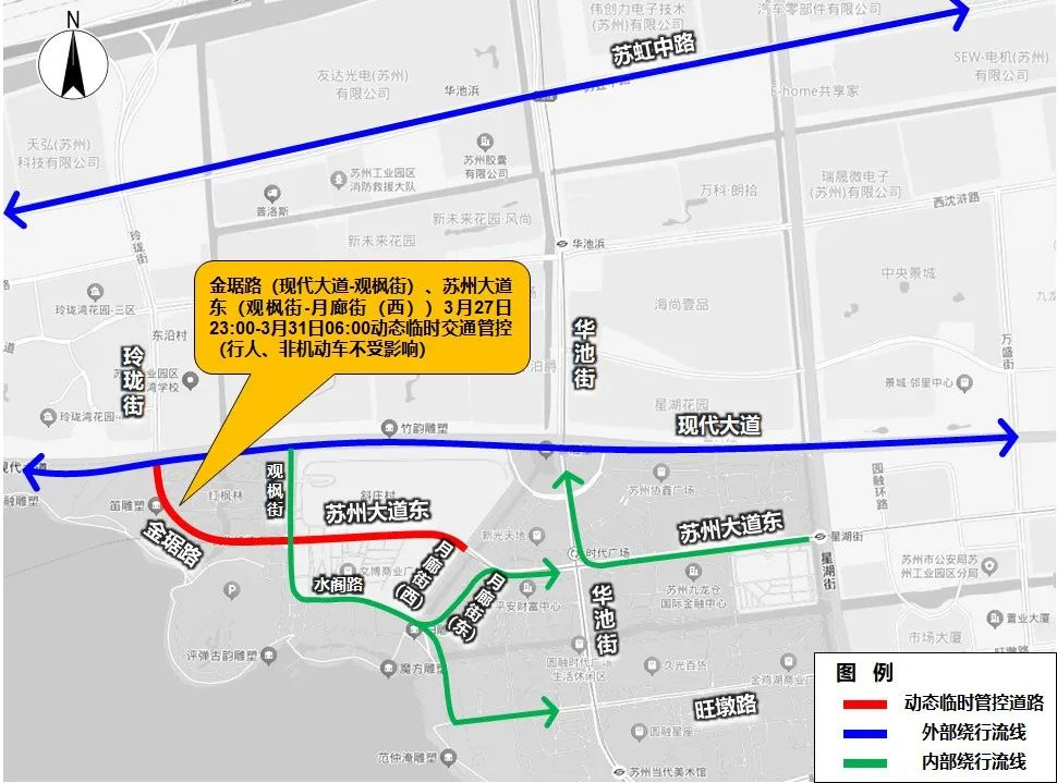 為保障本周(2025年3月28日-30日)蘇州國際博覽中心區域舉辦大型活動期間道路交通安全有序,根據《中華人民共和國道路交通安全法》相關規定,決定從2025年3月27日23:00至3月31日6:00期間,根據實際路況及交通管理需要,對蘇州大道東(觀楓街-月廊街(西))、金琚路(觀楓街-現代大道)機動車道采取動態交通臨時管控措施。臨時管控期間,禁止機動車在上述路段通行,非機動車、行人正常通行,途經機動車可以從玲瓏街、現代大道、水閣路、蘇虹路、華池街、旺墩路等道路繞行。