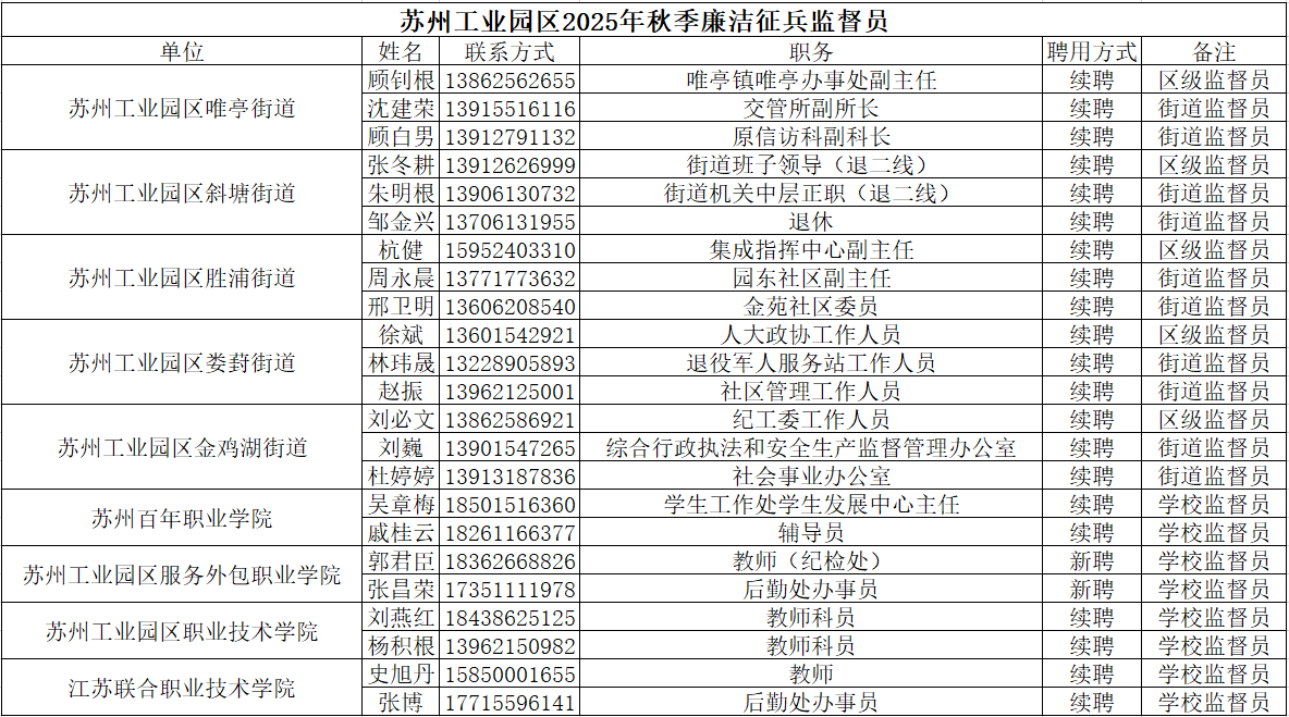 為切實維護平蘇州工業園區廣大應征青年的合法權益,增強征兵工作透明度,把好征兵工作廉潔關,自覺接受人民群眾監督,保證征兵工作公平、公正、公開,現依法將2025年度我市廉潔征兵監督員及監督舉報電話予以公布,歡迎社會各界對征兵工作進行監督。