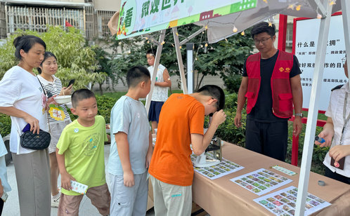 在微觀世界探秘區,顯微鏡成為了大家探索微觀世界的“魔法眼睛”。盲聞挑戰區則充滿了神秘與驚喜,芬芳的花朵、清新的草藥、香甜的果實……大家紛紛調動自己的嗅覺神經,努力猜出物品的名稱。舌尖上的夏日限定區則帶來了清涼的甜蜜,新鮮的西瓜、脆嫩的梨子、多汁的水蜜桃等夏日水果擺滿了桌子,大家品嘗著這些美味的水果,感受著大自然賦予的甜蜜滋味。此外,黨建共建單位的志愿者們也積極參與其中,不僅為活動提供了有力的支持,還向周邊的社區居民推廣了蘇州地鐵旅游票、支付寶優惠套餐等“省錢秘籍”,讓居民們在享受自然之美的同時,也能感受到實實在在的便利與實惠。