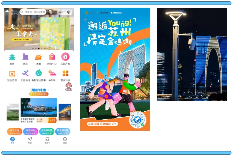 持續豐富智慧旅游應用,堅持數字賦能文旅發展,“惠游園區”文旅小程序、攜程文旅主題館、數字金雞湖APP、百度金雞湖一鍵智能游、金雞湖夜光跑道等場景涌現,環金雞湖智慧綜合桿及標識系統項目共1200個綜合桿掛載照明燈具、視頻監控、旅游風向標、廣播、基站、無線充電、LCD屏等智能化設備,實現“多桿合一、多箱合一、多管合一”。