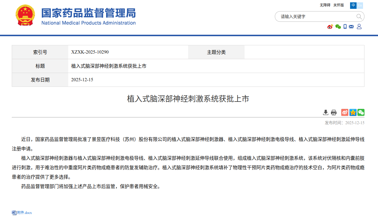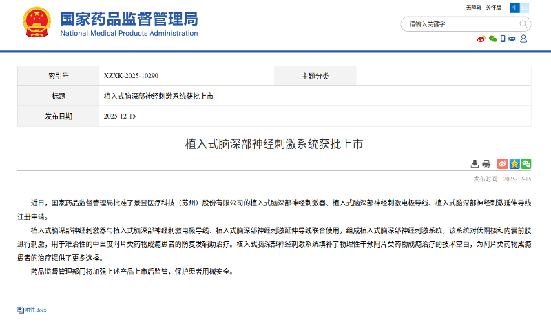 近日,國家藥品監(jiān)督管理局(NMPA)正式批準(zhǔn)景昱醫(yī)療科技(蘇州)股份有限公司的植入式腦深部神經(jīng)刺激器、植入式腦深部神經(jīng)刺激電極導(dǎo)線、植入式腦深部神經(jīng)刺激延伸導(dǎo)線三類產(chǎn)品注冊申請。此次獲批的植入式腦深部神經(jīng)刺激系統(tǒng),作為全球首創(chuàng)侵入式腦機接口治療成癮類精神疾病產(chǎn)品,標(biāo)志著中國在腦機接口治療成癮類精神疾病領(lǐng)域的技術(shù)已躋身全球領(lǐng)先行列,為全球難治性藥物成癮治療帶來突破性解決方案。