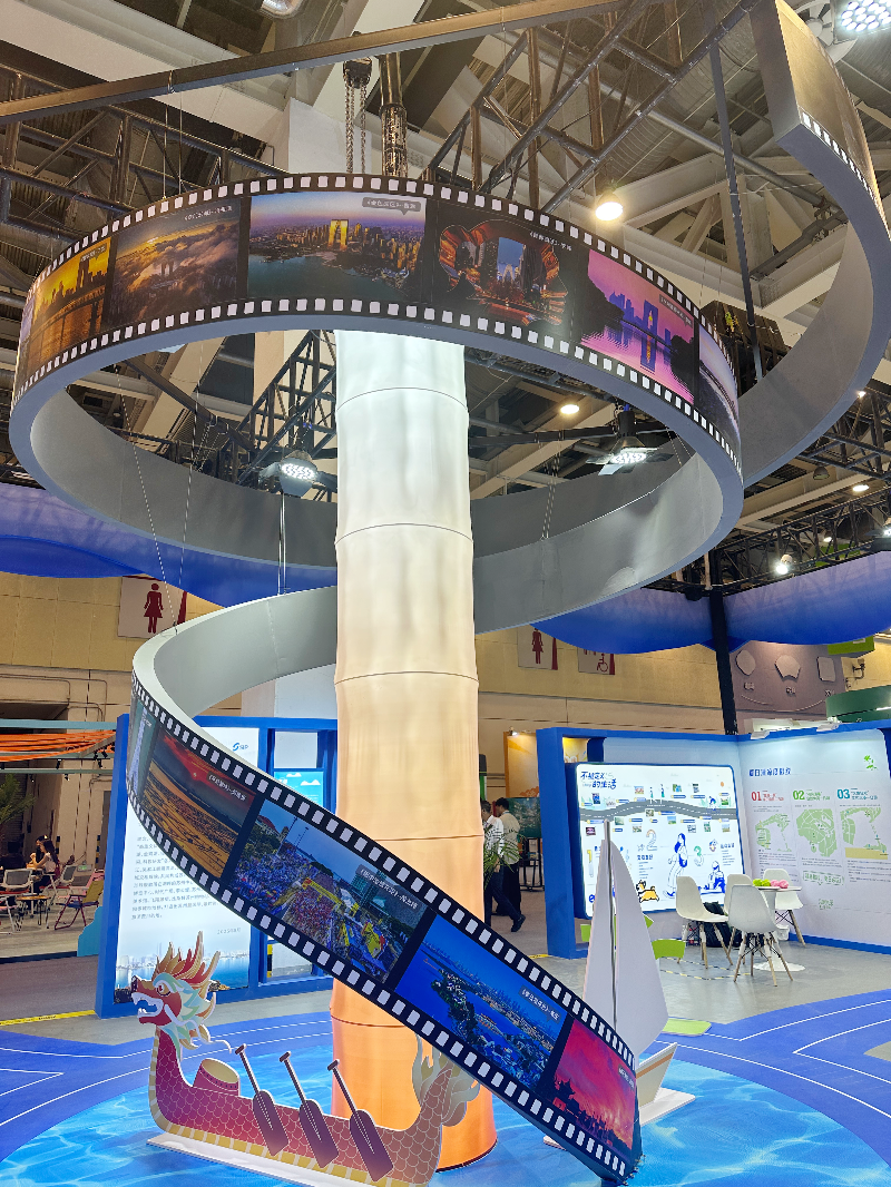 步入展廳,一座以“膠卷”為元素的大型裝置尤為醒目。該裝置由園區美景攝影作品拼接而成,自地面盤旋而上,凝練園區代表性的景觀精華和美好風貌,集中呈現園區文旅的非凡魅力。