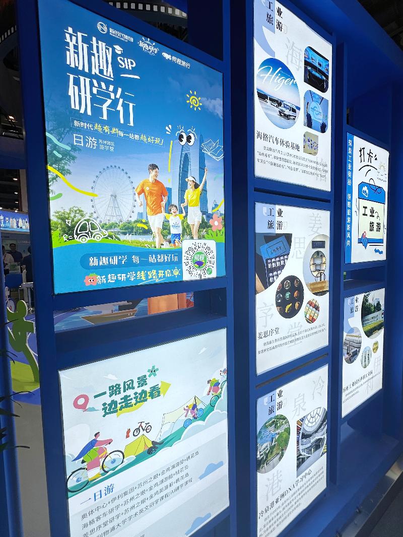 展廳中央更是藏著不少驚喜。“惠游園區”智慧文旅平臺的成果讓人眼前一亮,今年上半年,平臺總交易額破億元,注冊用戶達163.2萬人,成為園區商旅文體展集成服務主門戶;工業旅游區集中展示四大特色工業旅游點及“新趣研學”主題研學線路,詮釋“旅游+工業”創新實踐;近40家品牌酒店組成的LOGO集錦墻,彰顯園區作為兼具國際范、煙火氣與人文韻的文旅目的地的吸引力,亦是“宜居宜業宜游”創新之城的生動注腳。