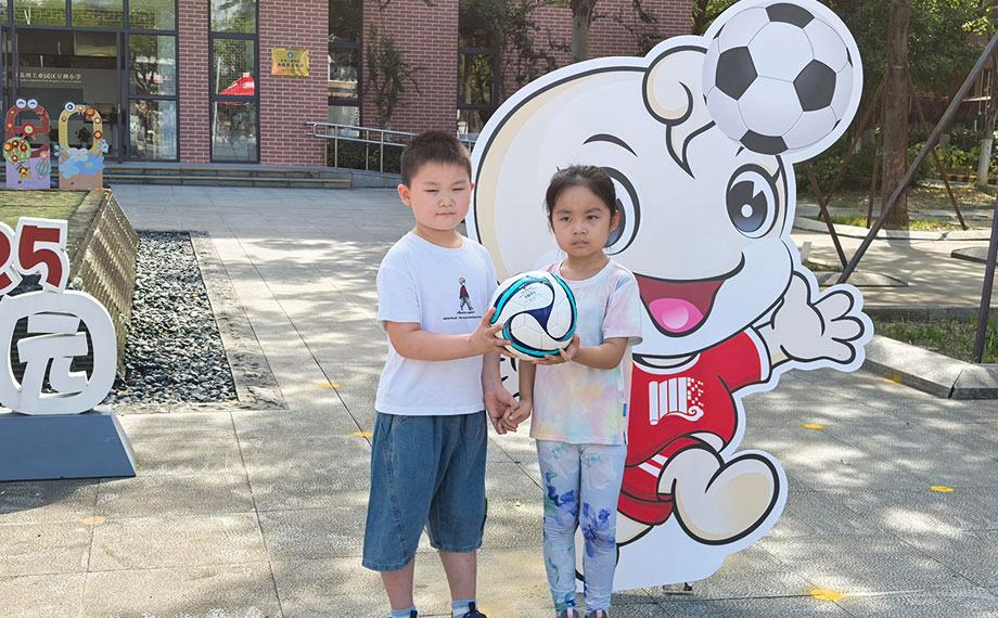 足球訓練標志組成了趣味關卡。高年級學生帶球穿梭,低年級則用“頂球”互動感受運動快樂。小小運動健將在校園里玩轉自己的“蘇超”,也在運動中更快融入校園美好生活。