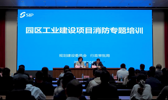 SIP Planning and Construction Committee and Administrative Examination and Approval Bureau jointly organized a training on Oct 29, aiming to enhance fire prevention for industrial construction projects. People from related authorities, risk assessment companies and project builders and operators participated.