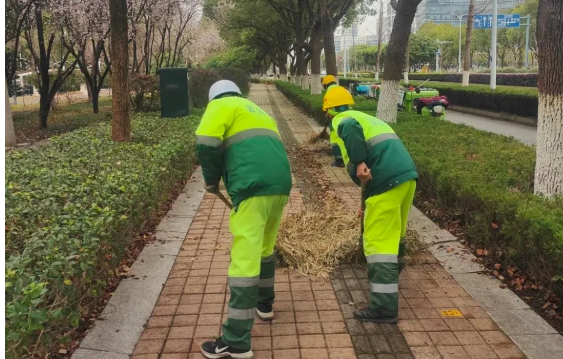 春風拂綠換新裝,園區城管加強道路落葉清掃