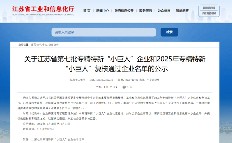 近日,江蘇省工業和信息化廳公示了江蘇省第七批專精特新“小巨人”企業和2025年專精特新“小巨人”復核通過企業名單,蘇州陽澄湖半島旅游度假區10家企業獲評,復核通過企業4家。