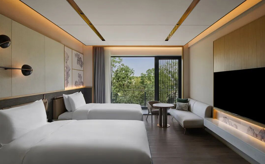 酒店擁有277間雅致客房、套房及6套獨(dú)立別墅。客房以清新淡雅的原木色調(diào),呈現(xiàn)簡約雅致的現(xiàn)代美學(xué)風(fēng)格,其間點(diǎn)綴的太湖石裝飾畫、中式屏風(fēng)等將蘇州園林意境巧妙融入,凸顯東方逸趣。客房自帶陽臺,配備65寸高清電視支持無線投屏功能,并配有輕智能馬桶、無線充電藍(lán)牙音響等智能化設(shè)備及高速無線網(wǎng)絡(luò)。房內(nèi)布置提取了太湖石、大閘蟹等蘇式元素進(jìn)行設(shè)計(jì),并臻選舒適床品與精致洗浴用品,讓旅途中的休憩倍添愜意。
